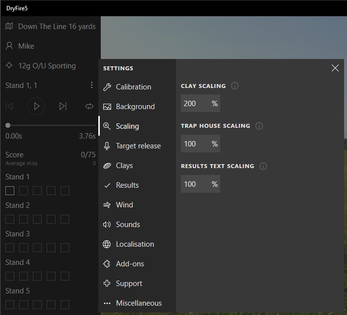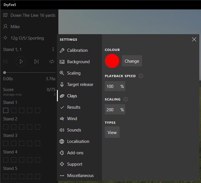 Note: making clays bigger won't make them easier to hit, just easier to see! DryFire calculates hit/miss based on real clay sizes.